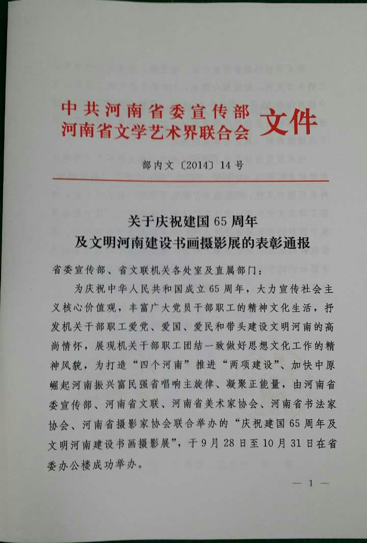關(guān)于慶祝建國65周年 及文明河南建設(shè)書畫攝影展的表彰通報